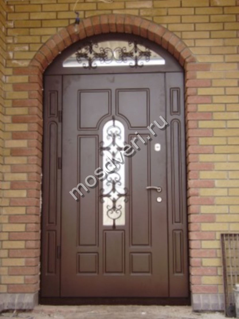 Вставки уличных входных дверей со стеклом защищены железной декоративной ковкой или литьем в виде художественной решетки.